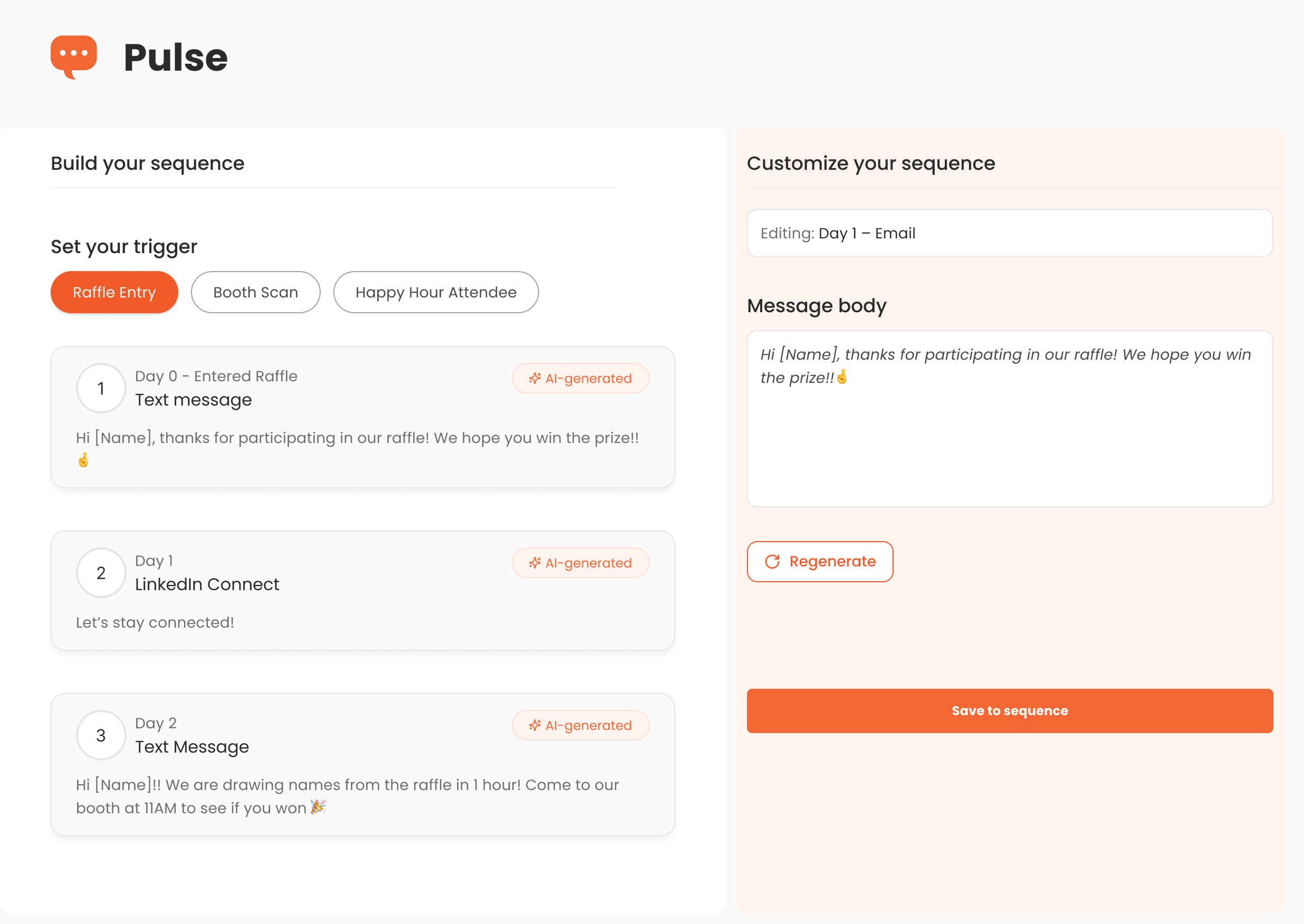 Last minute activations often require during-event outreach. Pulse lets you build the sequences that power that outreach on the fly, 100% based on in-person interactions.