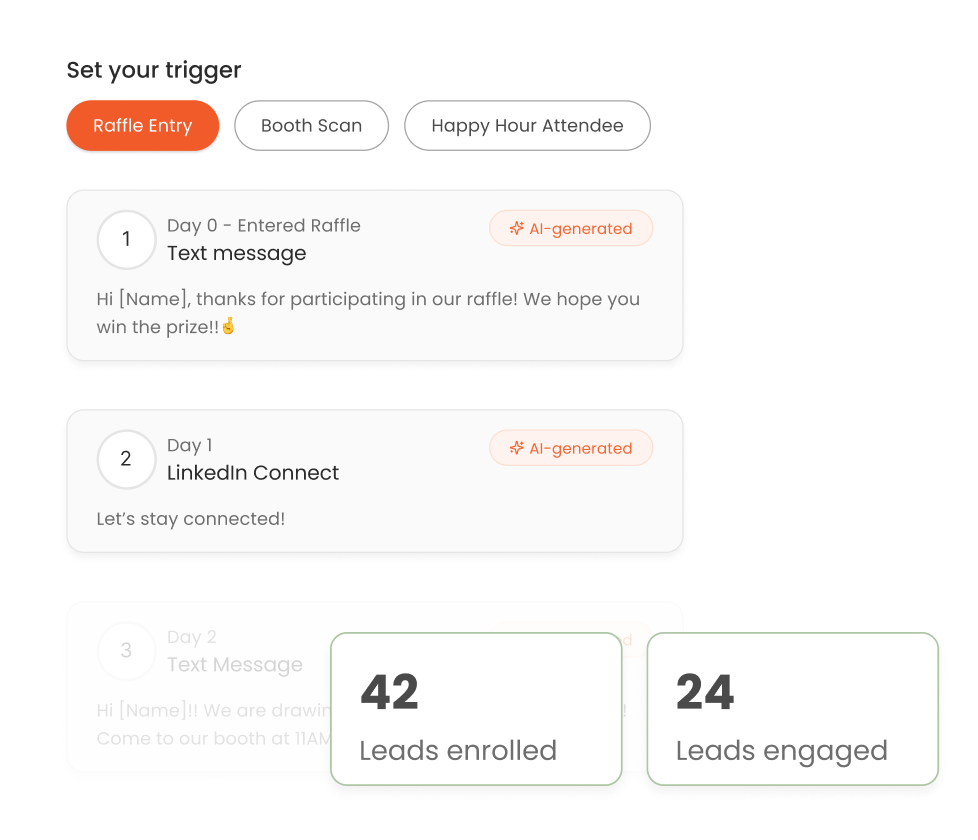 Use AI to build sequences triggered by in-person interactions that keep your team engaged with leads while they're still in the same building, without any integrations.